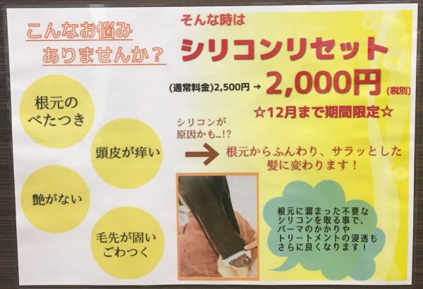 髪にとって不必要なシリコンを取り除き、健康な素髪の状態を維持し、髪質を改善するためのメニュー<シリコンリセット>のご紹介です!!