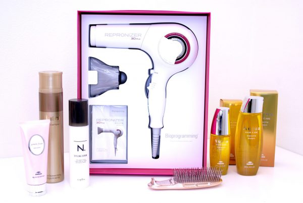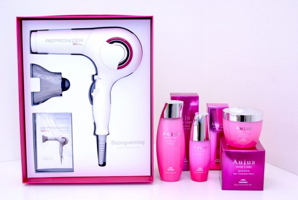 乾かした髪をツヤツヤに仕上げ、美顔器にもなる最新のドライヤー<レプロナイザー>と、新しくリニューアルした<オージュア>のホームケア商品のセットです。そして、更に!こちらにも<美髪革命>のお得なチケットが入っております。髪に良いことしてみませんか?
