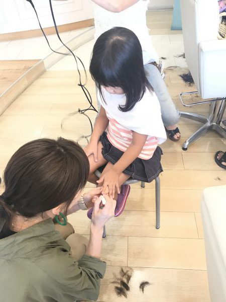 チャリティーイベントなので、お子様お一人につき¥500の募金をいただき、キッズカット、キッズネイル、ヘアアレンジを体験してもらいながら、ゲームやお菓子のプレゼント!お母様には待ち時間の間に眉カットのサービスをさせていただきました。