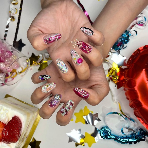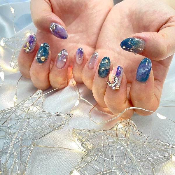 渋めなカラーや輝くパーツの組み合わせで、透き通った輝きの中にミステリアスさも感じるようなネイルデザインです。