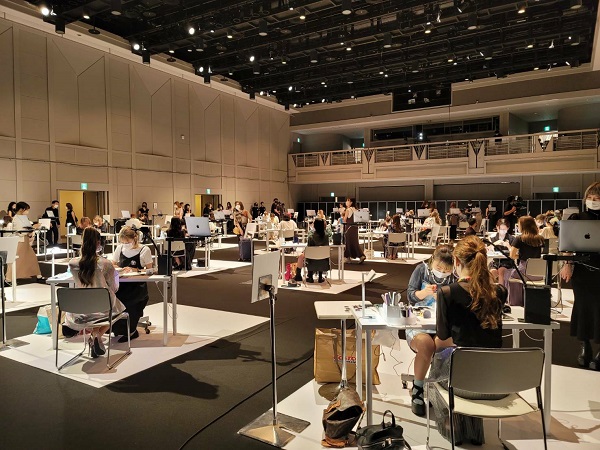 決勝では会場で90分間の作品作りを行います。作品のコンセプトはもちろん、施術工程を含めた審査が行われるため、審査員の方々の姿や手元をリアルタイムで映す機材も沢山…!