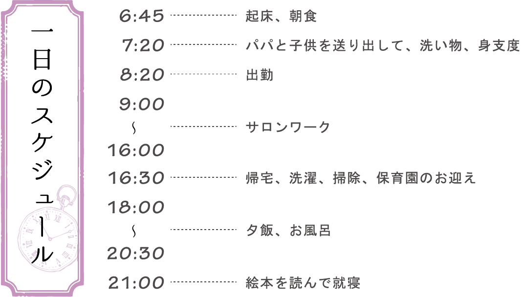 第一子出産を機にフルタイムから時短勤務へ。私が第一子を妊娠した時は、出産を機に辞めてしまうスタッフがほとんどだったので続けることへの迷いや不安もありましたが、“ママ美容師になる”背中を押してくれた長谷さん(社長)、理解協力してくれるスタッフ、支え合える家族のおかげで、